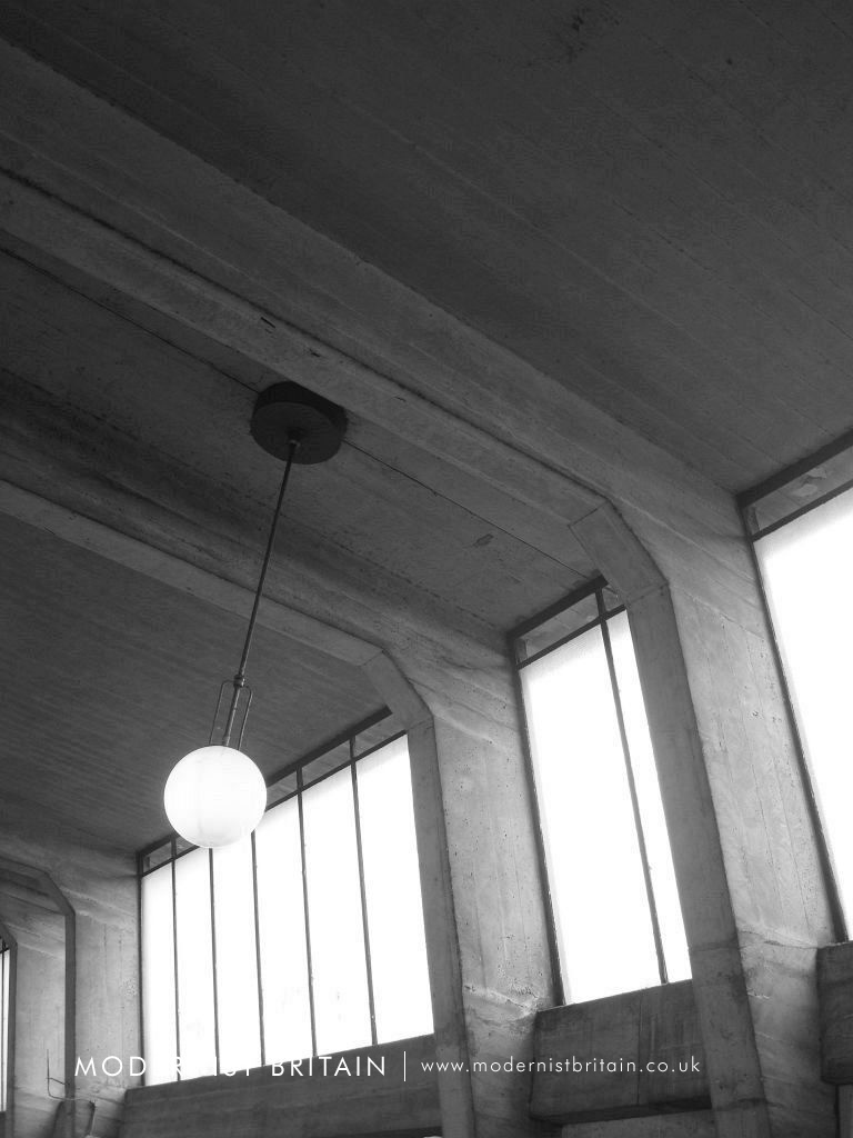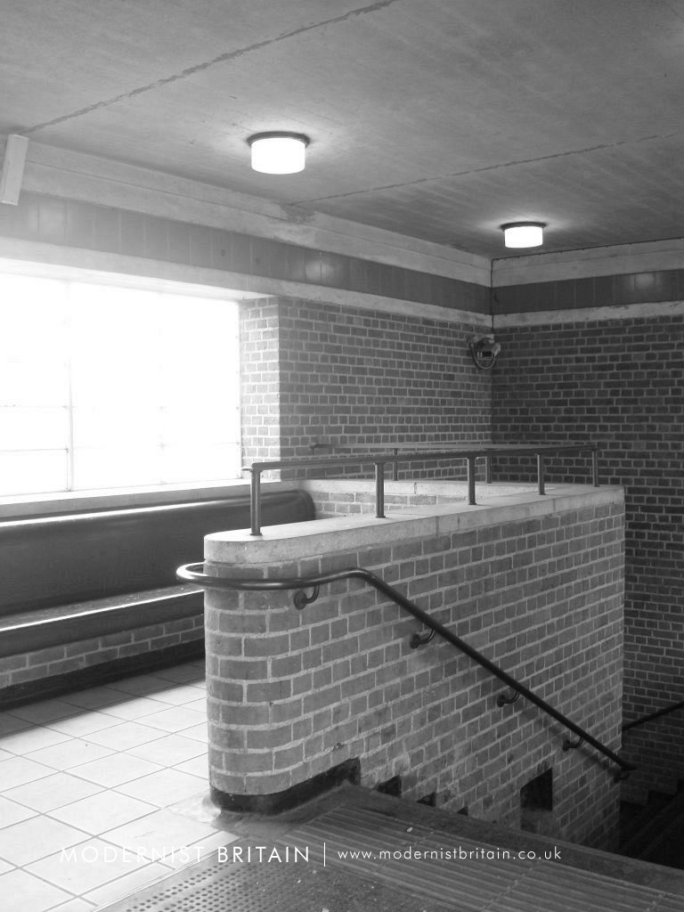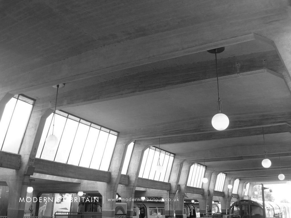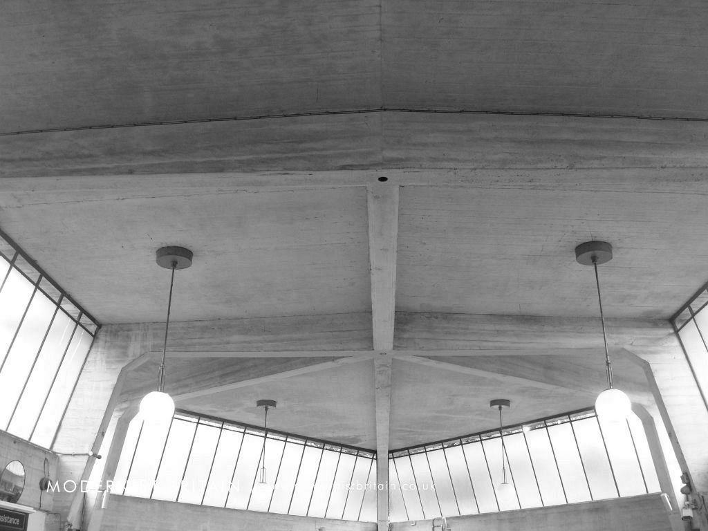 The ticket hall and platforms are set below the street level structure and are accessed by two staircases. The ticket hall and platforms are a revelation following the fairly conservative design implemented above. The ticket hall is a wide, open area with a central wooden ticket office (albeit un-used) surviving in-situ. The ticket hall is shaped like the prow of a ship, and this shape is most clearly seen looking at the impressive roof of the ticket hall, where the concrete frames join at the central point, forming a 'star' shape. Beyond, the structure forms a 'shed' over the platform, formed by prominent, irregularly spaced concrete frames, which are canted inwards. The 'shed' is brightly lit thanks to full height, metal framed clerestory windows set between the concrete frames. The ticket hall and platforms at Cockfosters are arguably the most dramatic and impressive of any station on the Underground network.