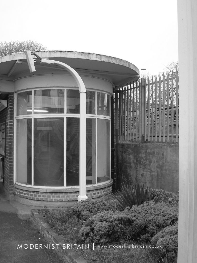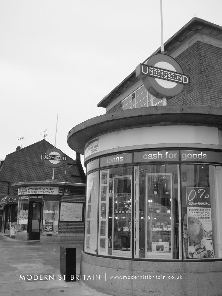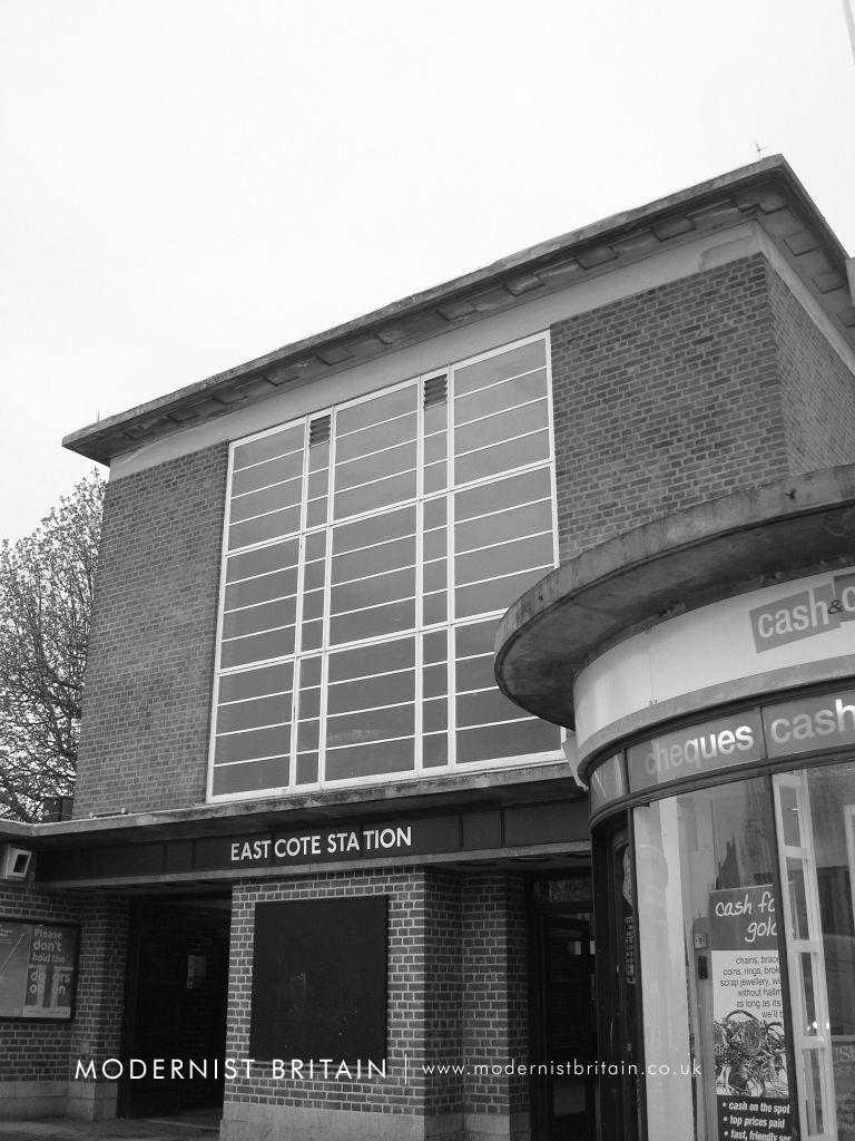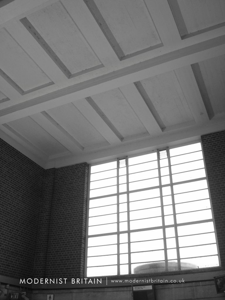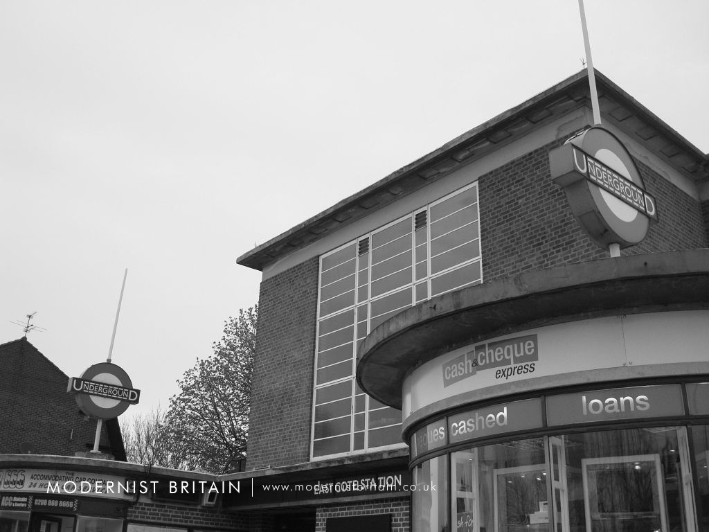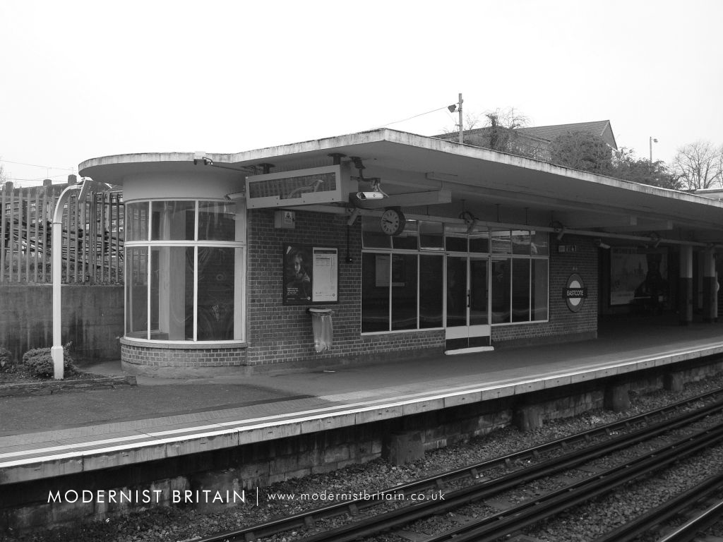Holden's design for Eastcote Station drew heavily on similar designs at Sudbury Town and Sudbury Hill. It is, however, not a copy but a well-executed evolution of the Sudbury model. Essentially a red-brick box with a concrete lid for a roof, Eastcote Station is a fine example of Holden's work. At street level the main entrance - of two separate sets of doors - is set back from two single-storey shops with large, curved glass windows. Above each shop is a large, pole-mounted 'Underground' roundel. The ticket hall forms a double height box, above the entrance, with a large metal framed window made up of alternating vertical bands of wide and narrow glass panes. A flat, concrete roof projects from the ticket hall, forming a pronounced lip. The platforms are set below the ticket hall - the ticket hall is above the tracks - and both north and southbound platforms are accessed by stepped stairwells with clerestorey glazing. At platform level there is extensive use of concrete with deeply cantilevered concrete roofs providing shelter and waiting rooms, with curved, glazed end walls. On the open platforms station signs, advertising space and platform lighting are cleverly combined into single units.