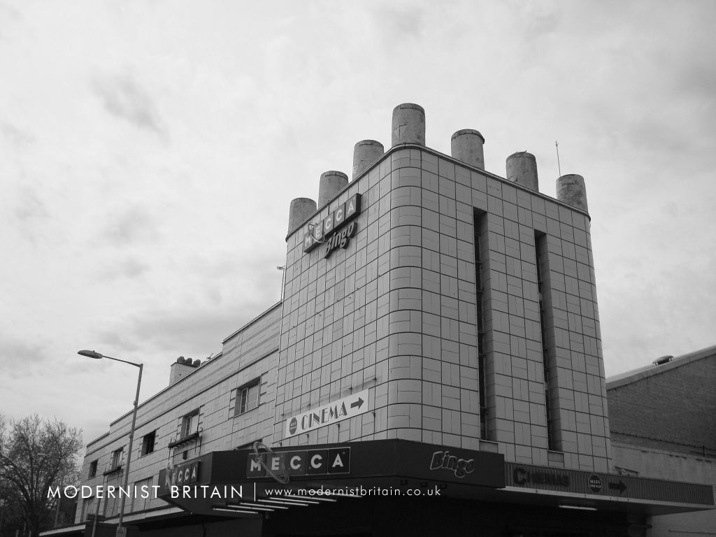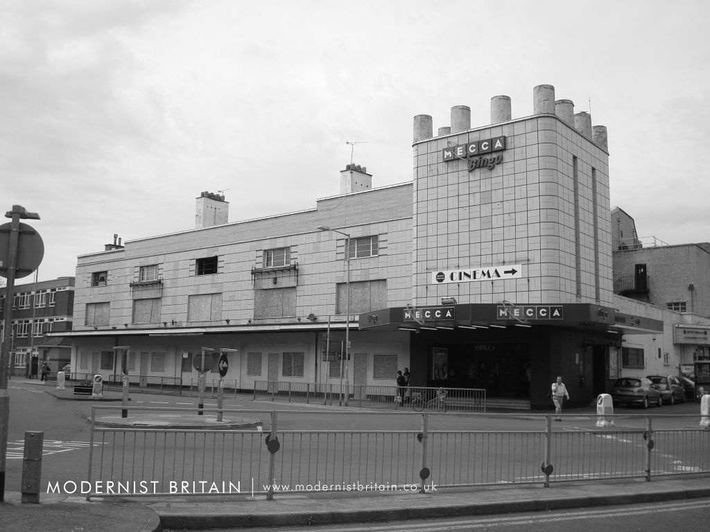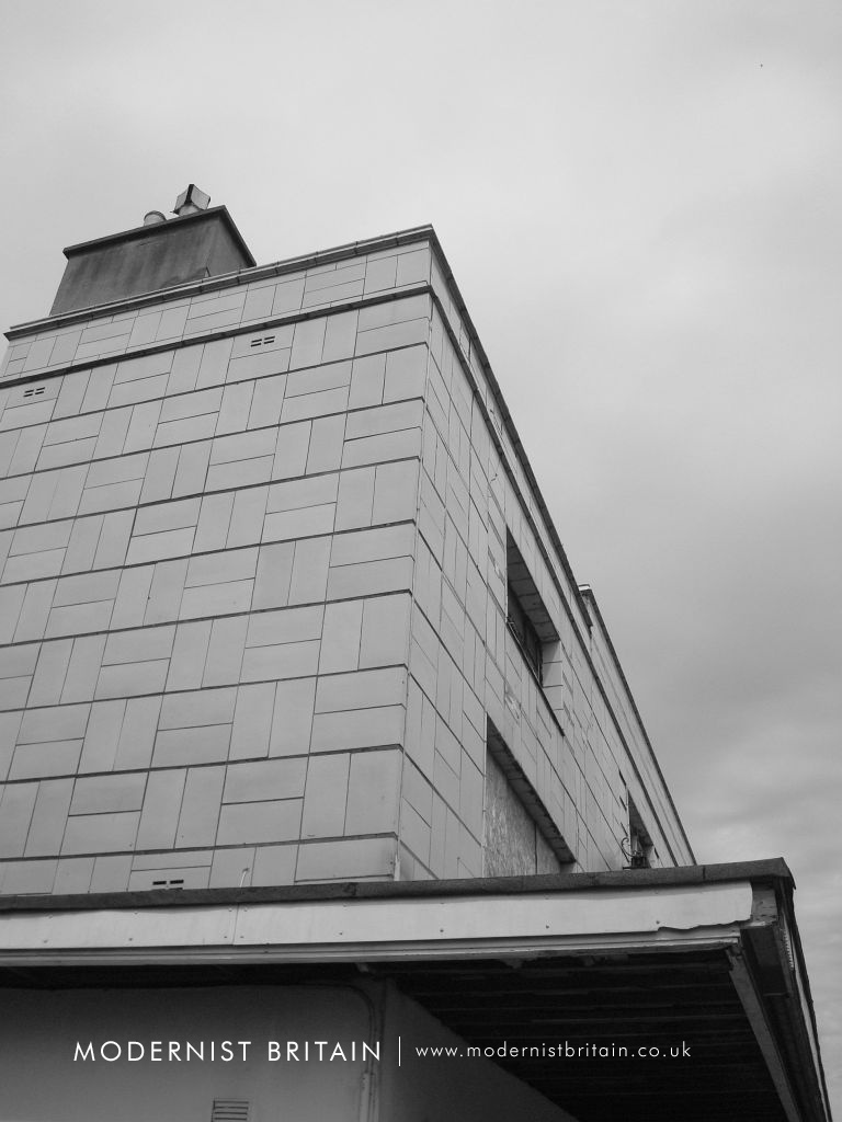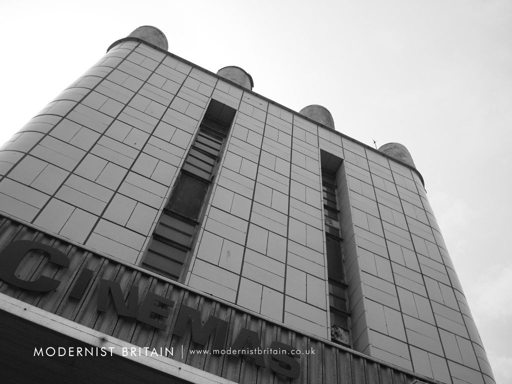 His design at Bridgwater aped that at nearby Weston-super-Mare, although the Odeon Bridgwater was a some-what simpler design than that seen at Weston-super-Mare. All four of Howitt's Odeons featured a square tower with a projecting flat slab roof supported by squat, cylindrical columns - the cinema at Bridgwater was the fourth of Howitt's cinema to use the slab tower. The corners or the tower are chamfered, as at Warley and Clacton - only Weston-super-Mare had 'sharp' corners to the tower. The east elevation of the slab tower has two slender full height, slit windows. A curved canopy projects outwards from the slab tower, above three sets of double doors providing access to the street via steps into the foyer.
