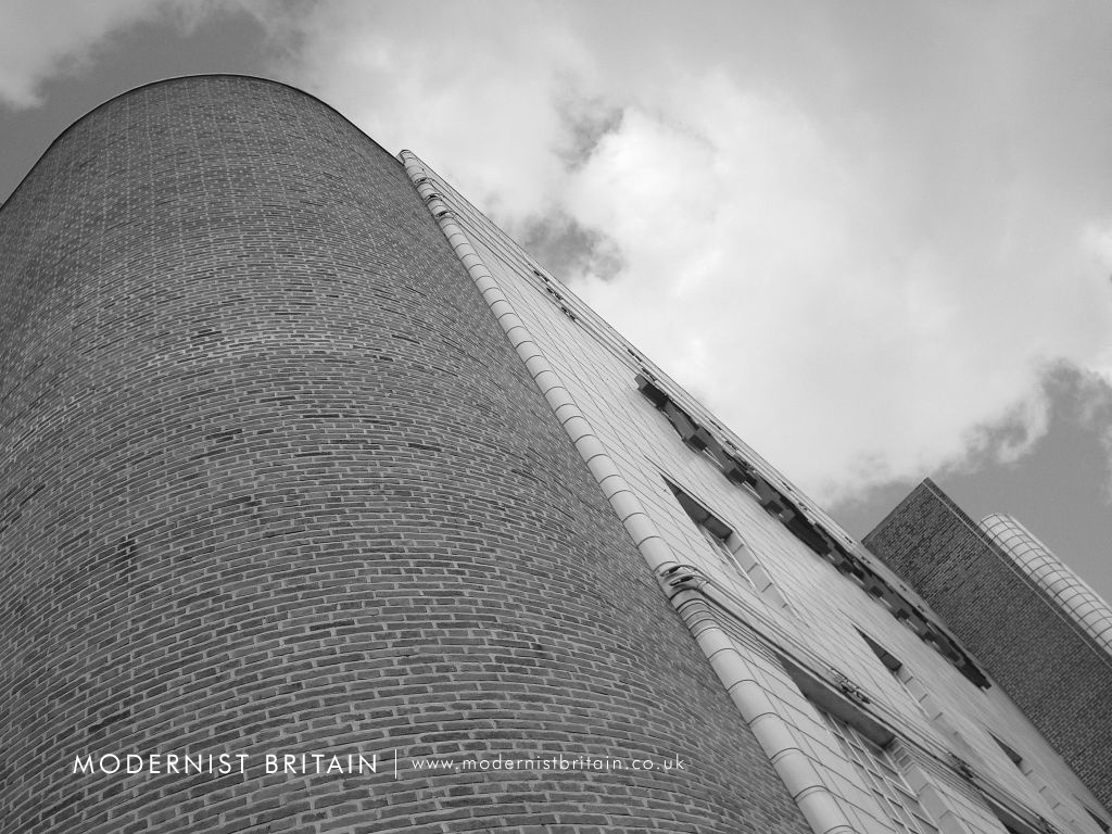 The tower stands at the outside corner of a six storey, brick clad block accommodating the main stairwell of the building. The block has a slender, narrow metal-framed window rising from first-floor level to its uppermost storey.