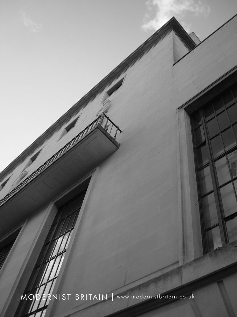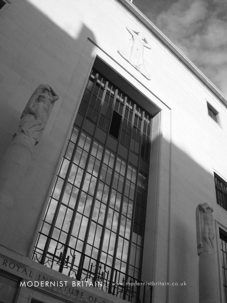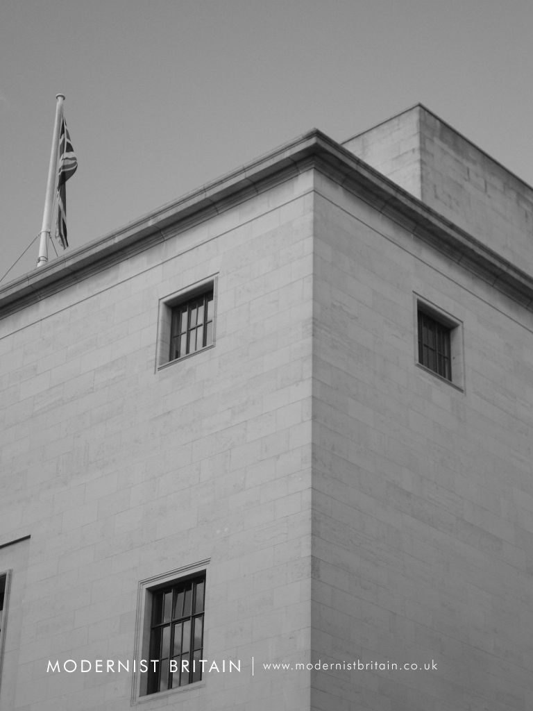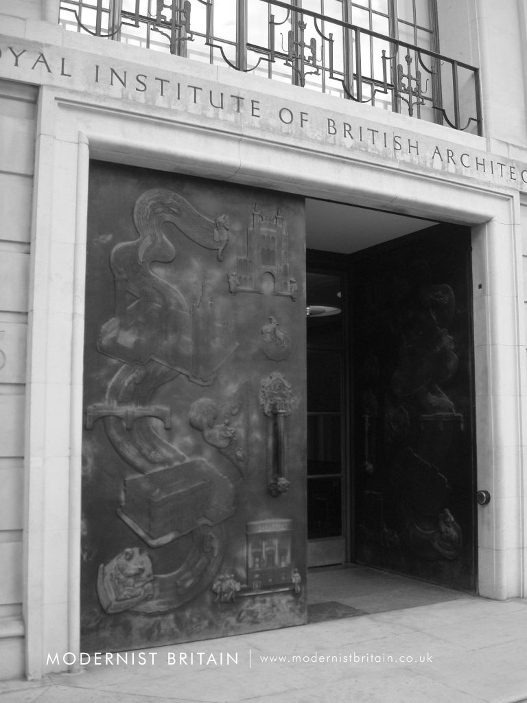 Between 1957 and 1958 the Royal Institute of British Architects extended its existing headquarters at 66 Portland Place in Central London to meet the expanding accommodation requirements of the organisation. The extensions - both upwards and outwards - were designed to harmonise with the existing Modernist building, designed by British architect George Grey Wornum. His design for 66 Portland Place was implemented between 1933, when the foundation stone was laid by the 8th Baron Howard de Walden on 28 June, and 1934 when the building was officially opened on 8 November by King George V and Queen Mary.