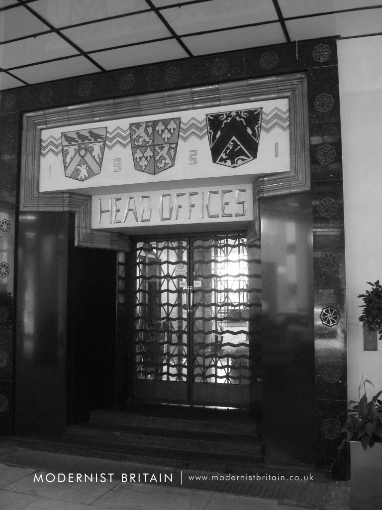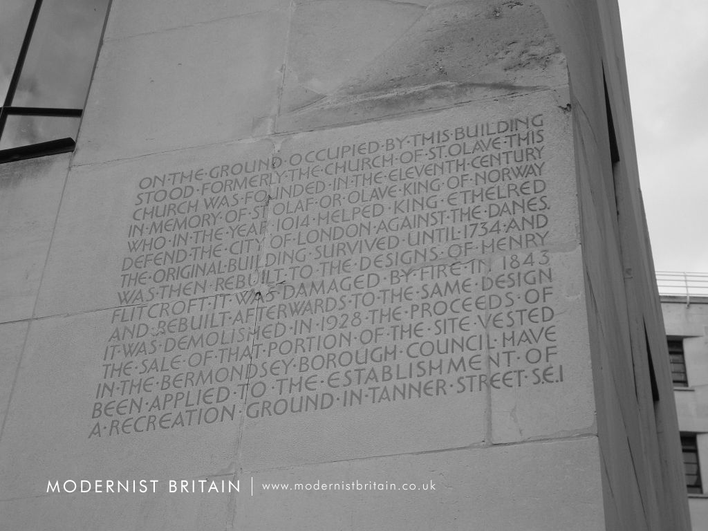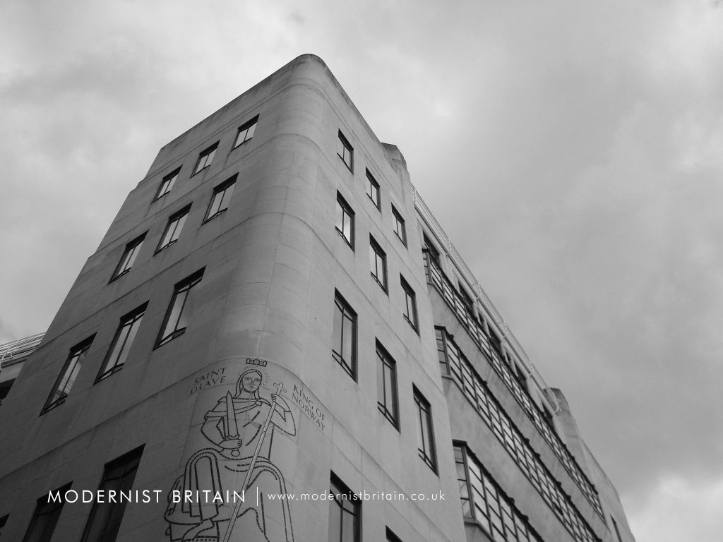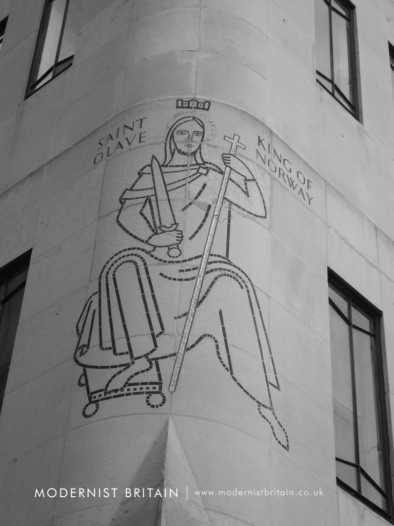 Other notably external decoration to the building are on the Tooley Street frontage. These are a figure of 'St Olave, King of Norway' in black and gold mosaic, also by Frank Dobson, and a carved inscription explaining the history of St Olave's Church that formerly stood on the site.