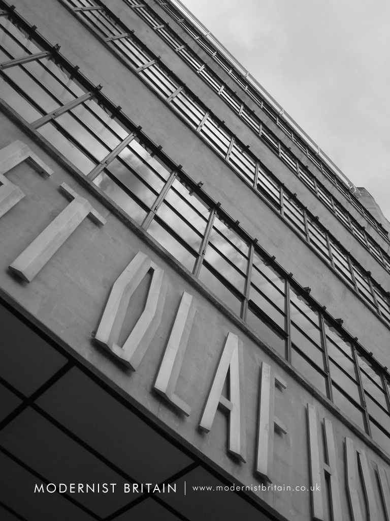 The river frontage in seven bays wide. At ground level the building is supported by six evenly spaced columns. The central three bays from the first to third floors are pierced by three tall, narrow windows surrounded by thirty-nine gilded and terracota panels edged in black granite. The panels were designed by British artist and sculptor Frank Dobson (1888-1963) and depicted scenes from the dockside, entitled 'Capital, Labour and Commerce'. The remaining windows on the lower three storeys and the two 'bands' on the fourth and fifth storeys are black-metal framed. The top storey features gilded lettering spelling out 'Hay's Wharf'.