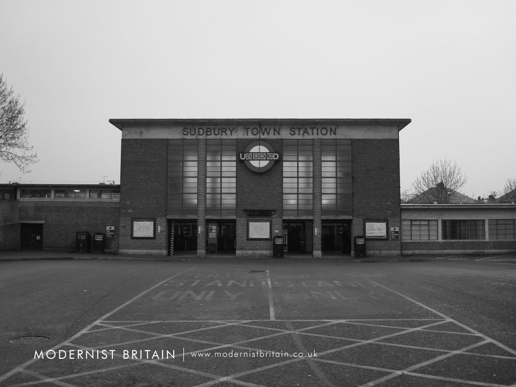 Holden modestly likened his design for Sudbury Town and subsequent stations to "brick boxes with concrete lids". Sudbury Town Station comprises a tall, central ticket hall with shorter wings either side. At street level two separate sets of doors provide access to the double-height ticket hall. Above the entrances two sets of tall, metal-framed windows provide light into the hall. A flat, concrete roof projects from the ticket hall. Beneath the roof-line a concrete band carries the station name. The wings either side of the ticket hall contain the station facilities and waiting room.