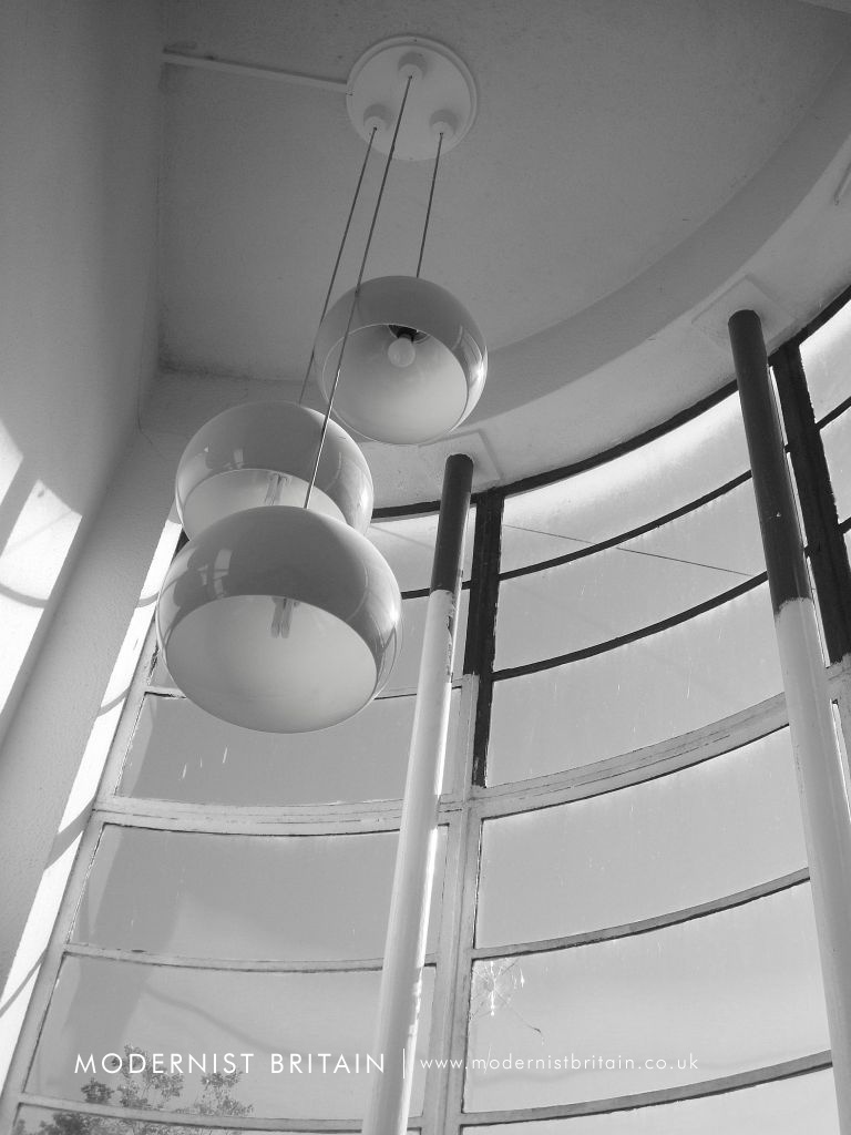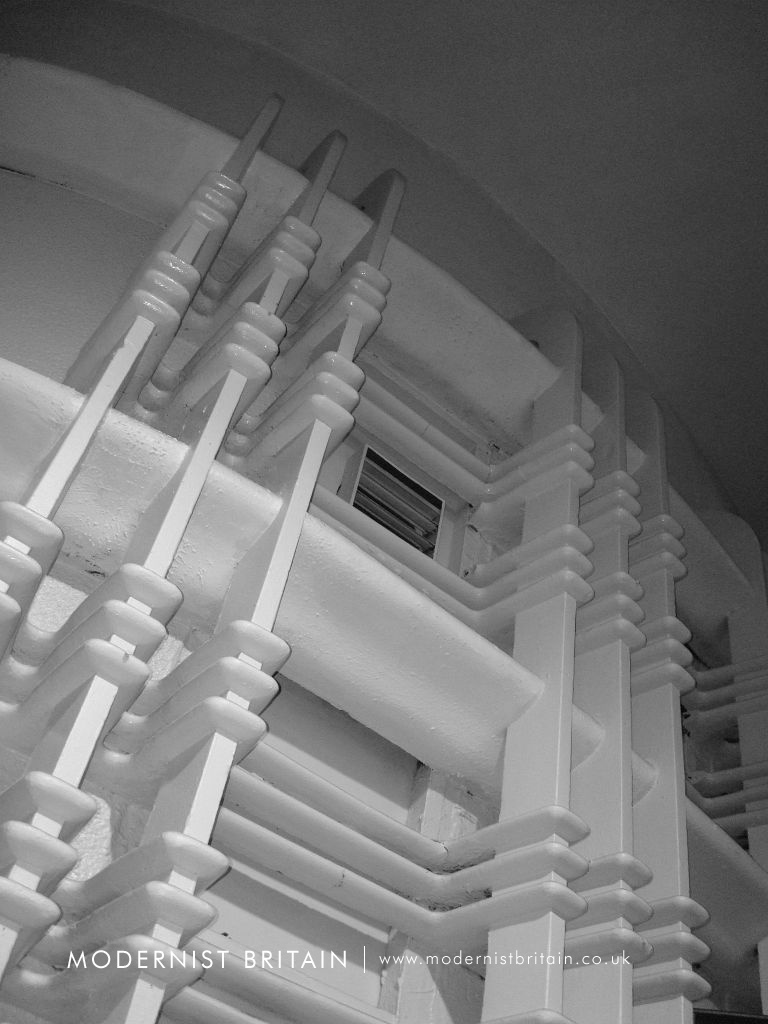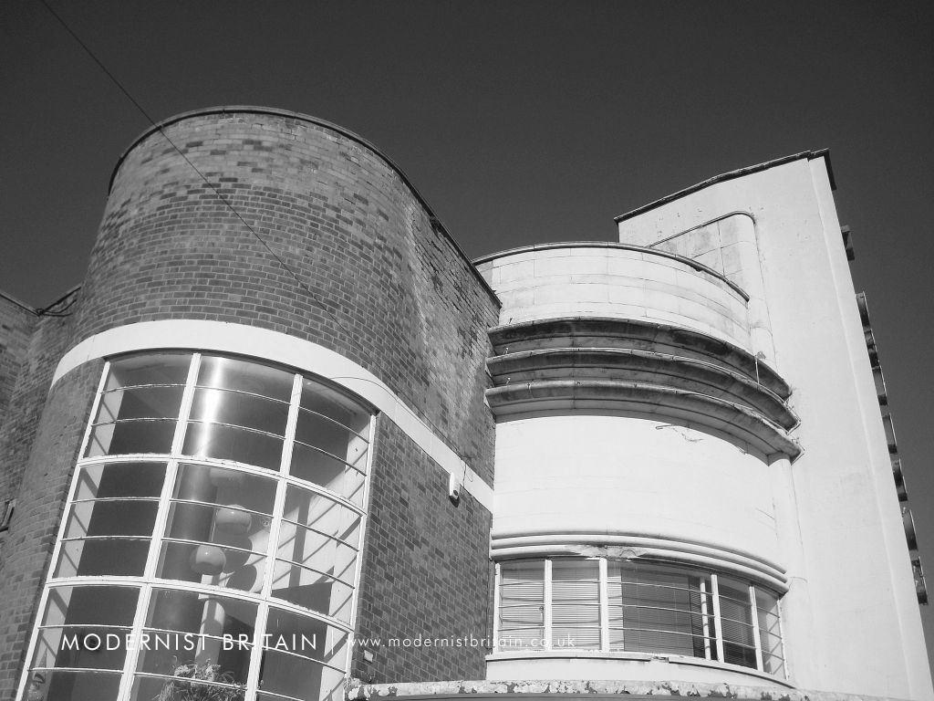 The central section has full-width white-painted Crittall-style windows, with distinct horizontal framing, at first-storey level, whilst above is a faience-tile clad parapet. Attached to the uppermost part of the parapet are three, flat horizontal fins projecting from the facade. The fins themselves are formed of three curved, overlapping elements.