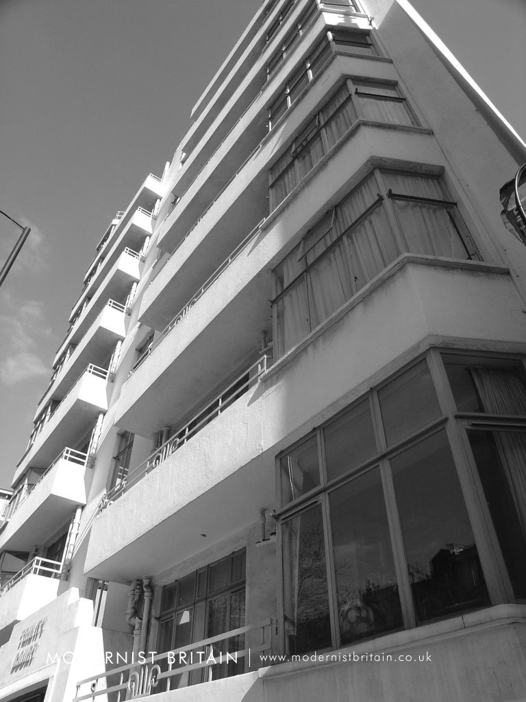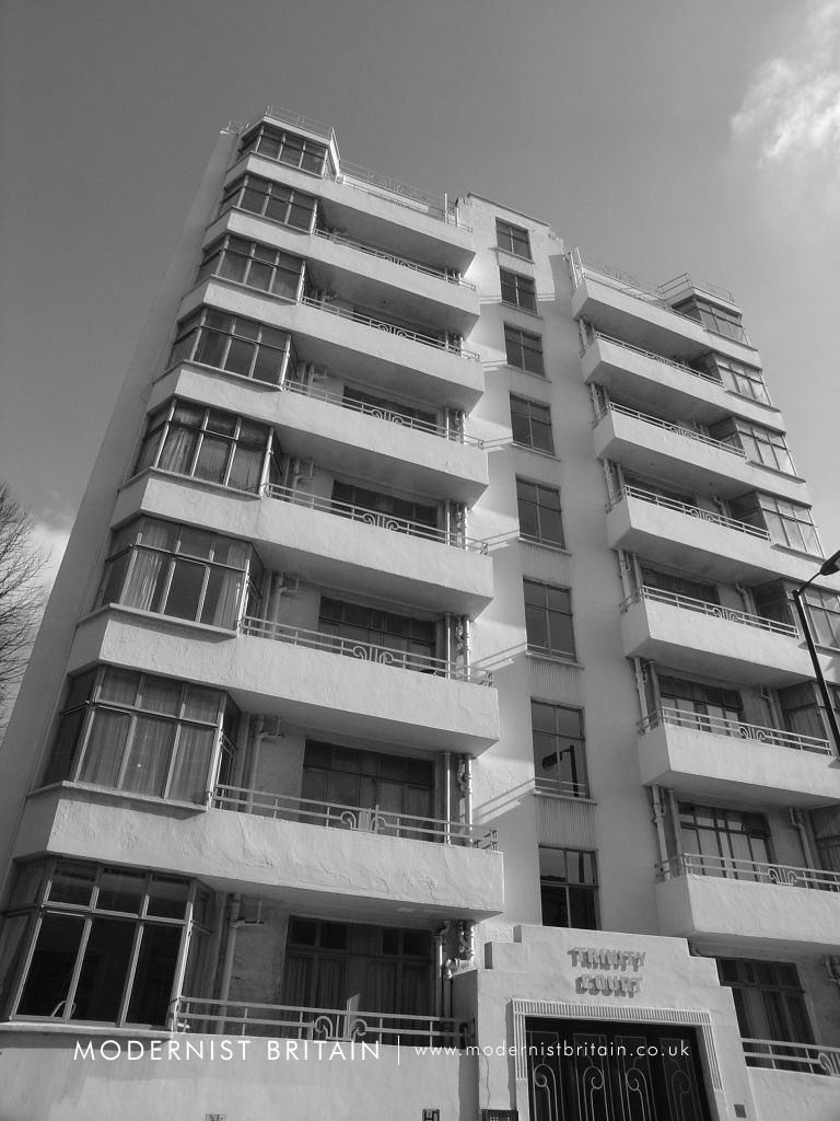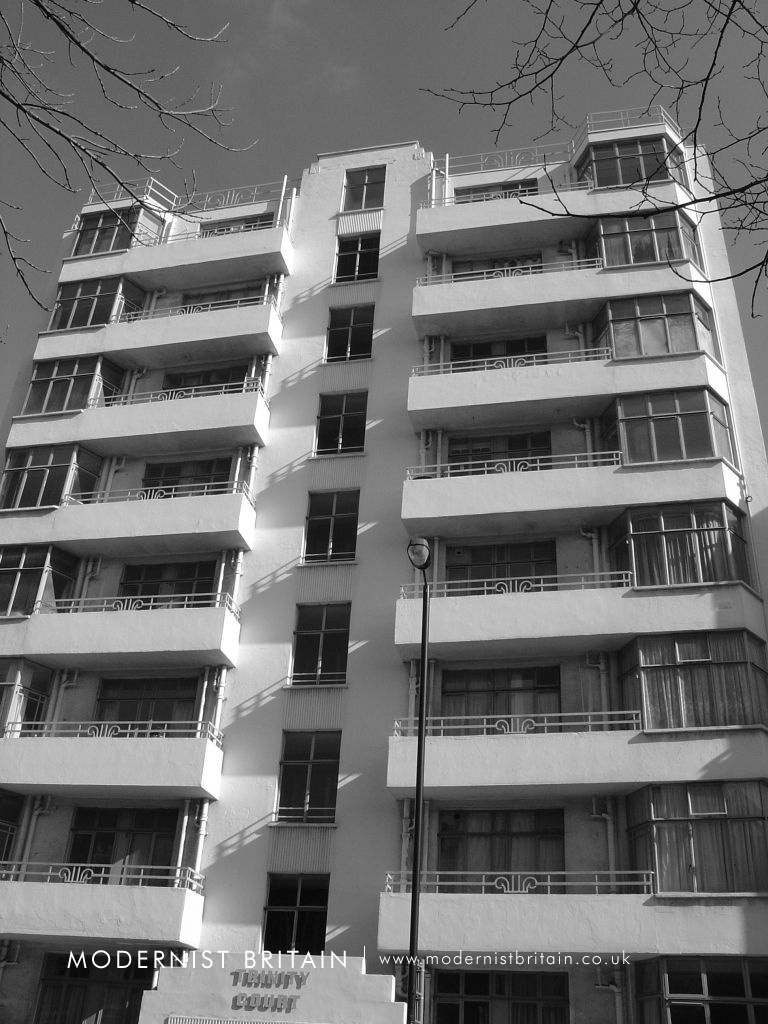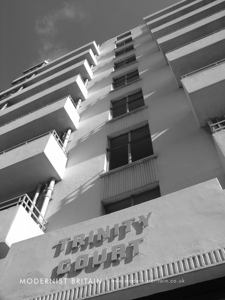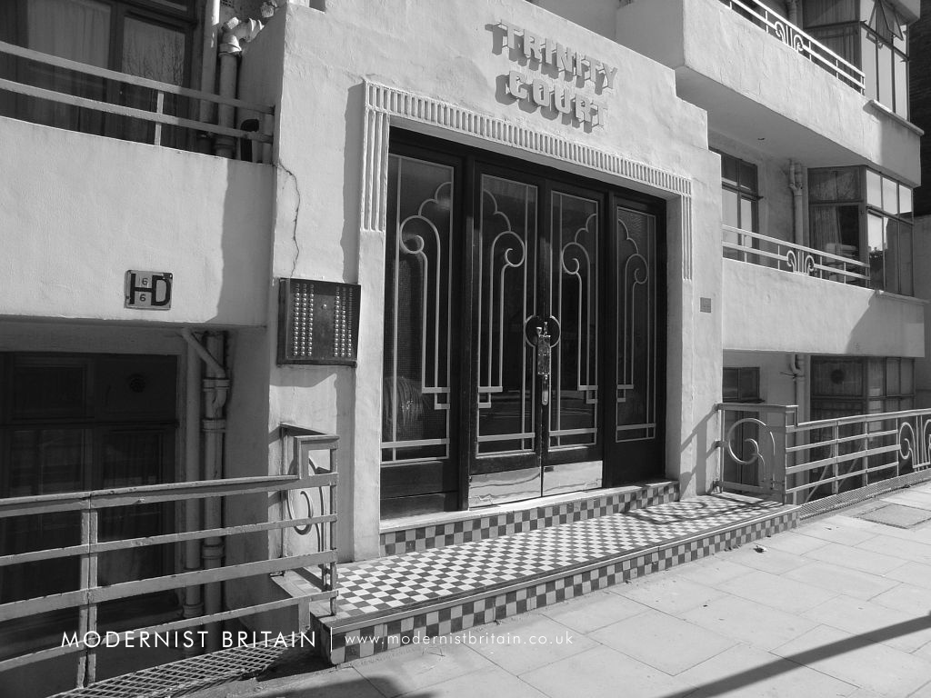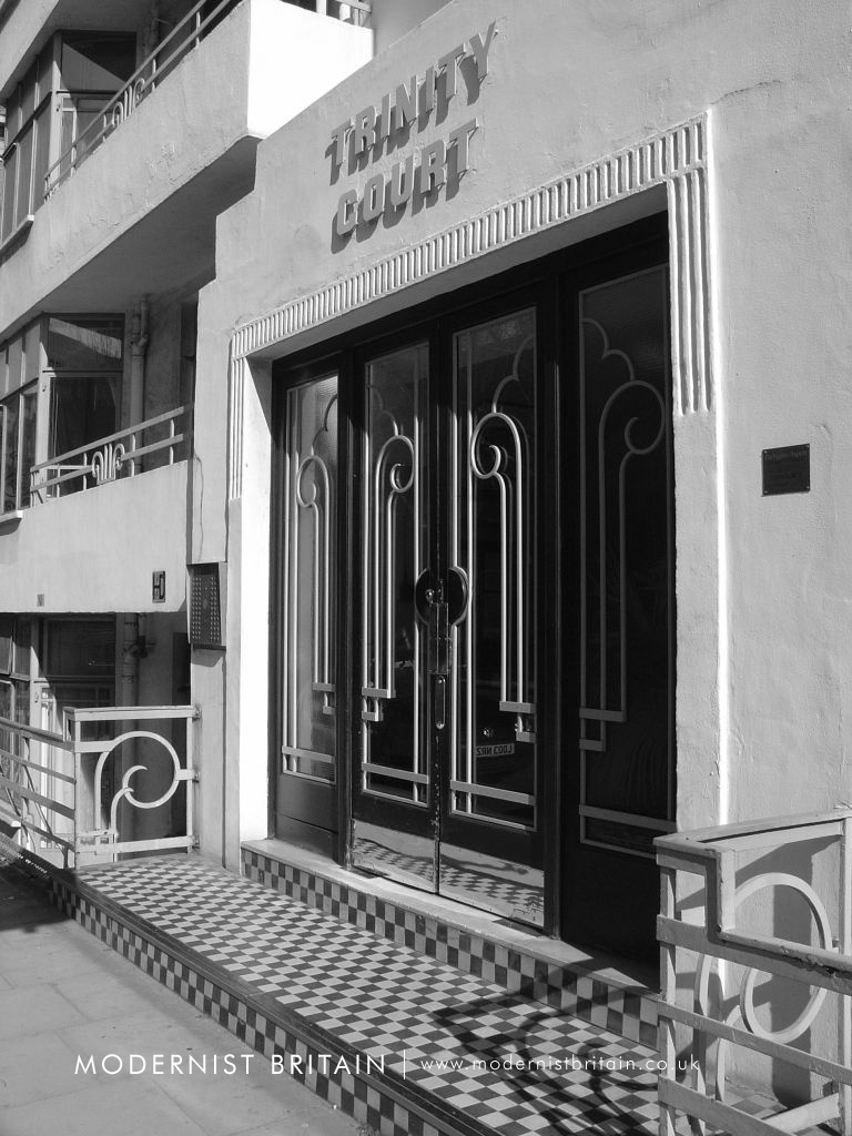 Trinity Court was built between 1934 and 1935 to plans drawn up by the London-based architectural practice of F Taperell and Haase. Another example of their work is Heathview, on Gordon House Road in north London (near to Gospel Oak Overground station). Although somewhat wider than Trinity Court, the similarities between Heathview and Trinity Court are plain, particularly the bay windows treatment, the balconies and their railings, and the checkerboard pattern on the steps to the entrance.